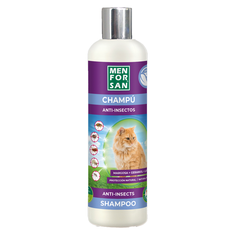 Champú de máxima calidad para gatos con 3 ingredientes naturales MARGOSA, GERANIOL y LAVANDINO, repelentes que eliminan durante el proceso de lavado todo tipo de insectos y parásitos. Además este champú puede ser utilizado de forma frecuente.\r\n\r\nLa MARGOSA (NEEM) es un insecticida natural que elimina todo tipo de insectos presentes en la piel o el pelaje (pulgas, garrapatas, chinches, ácaros).\r\n\r\nEl GERANIOL y el LAVANDINO, repelentes naturales, proporcionan una protección adicional repeliendo todo tipo de insectos voladores (moscas, tábanos, avispas).\r\n