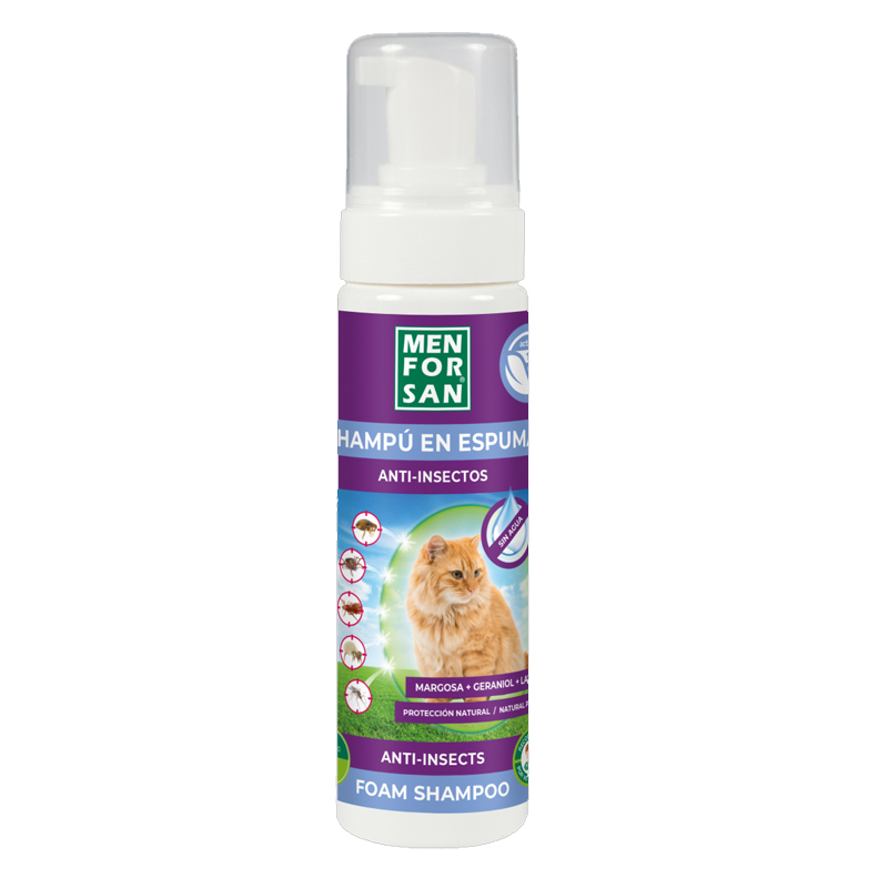 Limpia y actúa en cualquier parte del cuerpo y del pelaje de gatos sin utilización de agua. La espuma contiene 3 activos naturales, MARGOSA, GERANIOL y LAVANDINO que funcionan como repelentes de infestaciones de todo tipo de insectos parásitos y voladores (pulgas, garrapatas, chinches, ácaros y mosquitos).\r\n\r\nLa MARGOSA (NEEM) es un insecticida natural que elimina todo tipo de insectos presentes en la piel o el pelaje (pulgas, garrapatas, chinches, ácaros).\r\n\r\nEl GERANIOL y el LAVANDINO, repelentes naturales, proporcionan una protección adicional repeliendo todo tipo de insectos voladores (moscas, tábanos, avispas).\r\n
