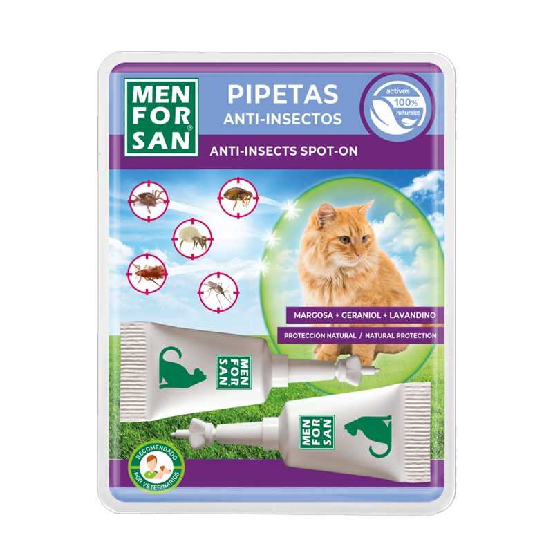 Pipetas anti-insectos para gatos que contienen 3 activos repelentes naturales MARGOSA, GERANIOL Y LAVANDINO que protegen de las infestaciones de parásitos externos pulgas, garrapatas, piojos ácaros y también de las picaduras de mosquitos\r\n\r\nLa MARGOSA (NEEM) es un insecticida natural que elimina todo tipo de insectos presentes en la piel o el pelaje (pulgas, garrapatas, chinches, ácaros).\r\n\r\nEl GERANIOL y el LAVANDINO, repelentes naturales, proporcionan una protección adicional repeliendo todo tipo de insectos voladores (moscas, tábanos, avispas).\r\n