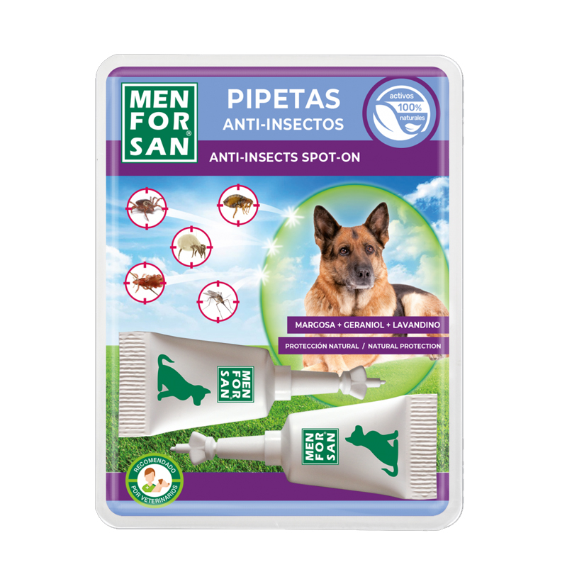Pipetas anti-insectos para perros que contienen 3 activos repelentes naturales MARGOSA, GERANIOL Y LAVANDINO que protegen de las infestaciones de parásitos externos pulgas, garrapatas, piojos ácaros y también de las picaduras de mosquitos\r\n\r\nCada pipeta contiene 1,5 ml de producto.\r\n\r\nLa MARGOSA (NEEM) es un insecticida natural que elimina todo tipo de insectos presentes en la piel o el pelaje (pulgas, garrapatas, chinches, ácaros).\r\n\r\nEl GERANIOL y el LAVANDINO, repelentes naturales, proporcionan una protección adicional repeliendo todo tipo de insectos voladores (moscas, tábanos, avispas).\r\n