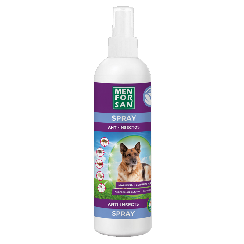 Spray natural para animales perros con MARGOSA, GERANIOL y LAVANDINO.\r\n\r\nLa MARGOSA (NEEM) es un insecticida natural que elimina todo tipo de insectos presentes en la piel o el pelaje (pulgas, garrapatas, chinches, ácaros).\r\n\r\nEl GERANIOL y el LAVANDINO, repelentes naturales, proporcionan una protección adicional repeliendo todo tipo de insectos voladores (moscas, tábanos, avispas).\r\n